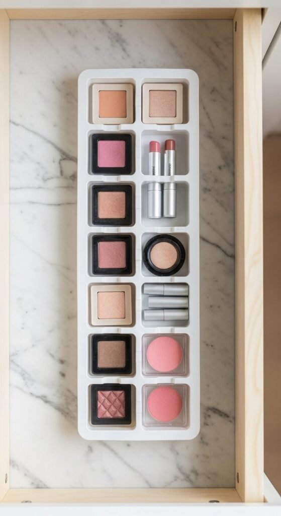 Ice cube trays are secretly perfect for small product storage inside drawers. Each compartment fits a single eyeshadow pan, travel-size product, or lip liner cap perfectly. You can buy silicone trays in different sizes for $2–$5. Place them inside a drawer to create a fully customized grid. Great for travel kits too. If you have a large collection of single pan shadows, this DIY gives you a clean, sorted system in minutes.