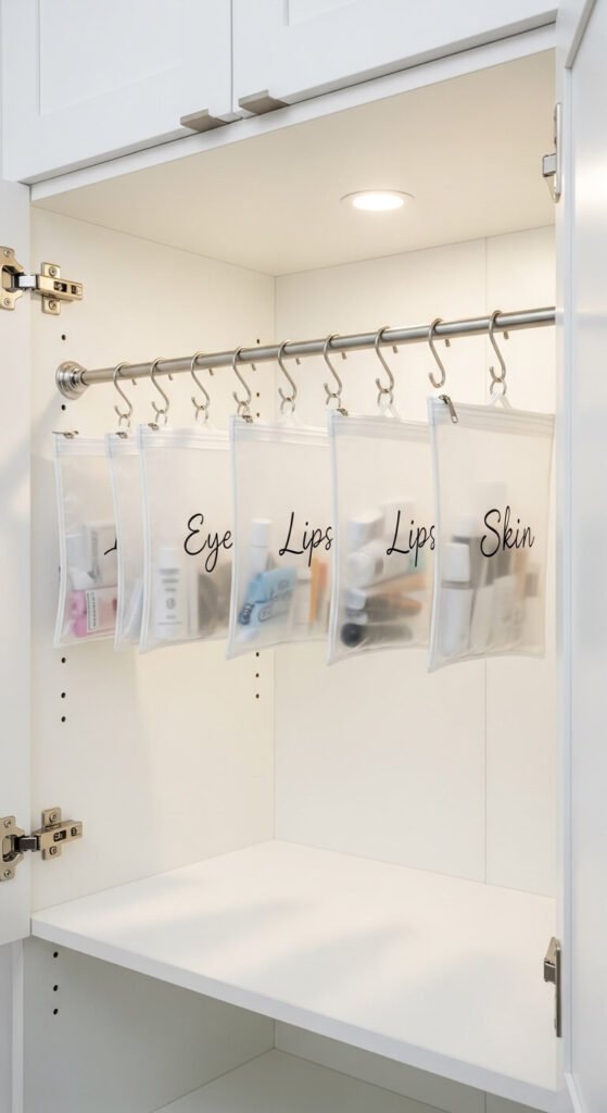 Mount a tension rod inside a cabinet and hang small pouches from S-hooks. Label each pouch by category for a fully sorted, hidden system. This uses dead vertical space inside your cabinet and keeps products off shelves. Tension rods cost $3–$8 and S-hooks under $5 for a pack. Add clear zip pouches from the dollar store. You get a completely hidden, organized system that keeps your cabinet from becoming a dumping ground.