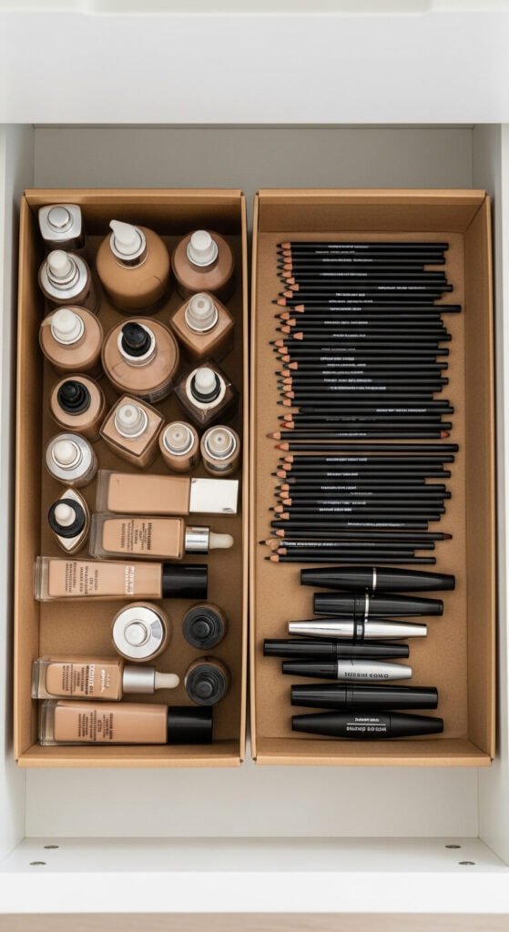 Shoe boxes are free organizers hiding in your closet. Cut them down to fit your drawer and use them as dividers. Cover the inside with wrapping paper or washi tape to make them pretty. One box per category keeps products separated without buying anything new. This works especially well in deep drawers that tend to become black holes for makeup. Sturdy, customizable, and completely free to make.