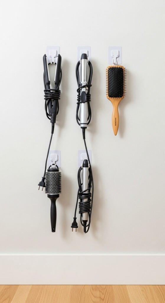 Adhesive command hooks on a wall keep hair tools and accessories completely off the counter. Hang flat irons, curling wands, hairbrushes, and even small bags. Command hooks hold several pounds and come off cleanly without damaging walls. A pack of 4–6 hooks costs $4–$8. This works in any rental apartment. Dedicate one wall section to your tools and wrap cords around each one to keep things tidy. Simple and totally renter-friendly.