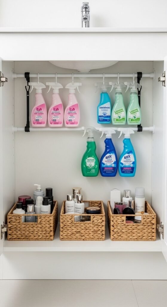 Install a tension rod under your bathroom sink to create an extra hanging level. Hang spray bottles and small product bags from the rod to free up floor space inside the cabinet. Add baskets on the lower level for bulkier items. The rod costs $3–$8 and requires no tools. This simple trick doubles your under-sink storage in minutes. Great for storing skincare, cleaning supplies, and hair products all in the same cabinet.