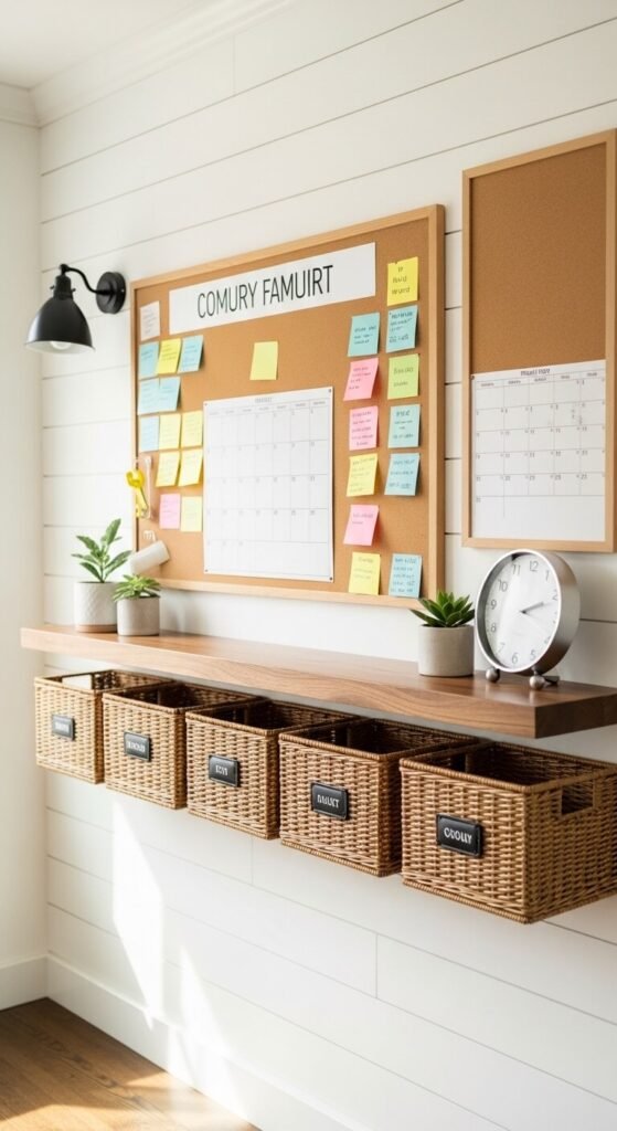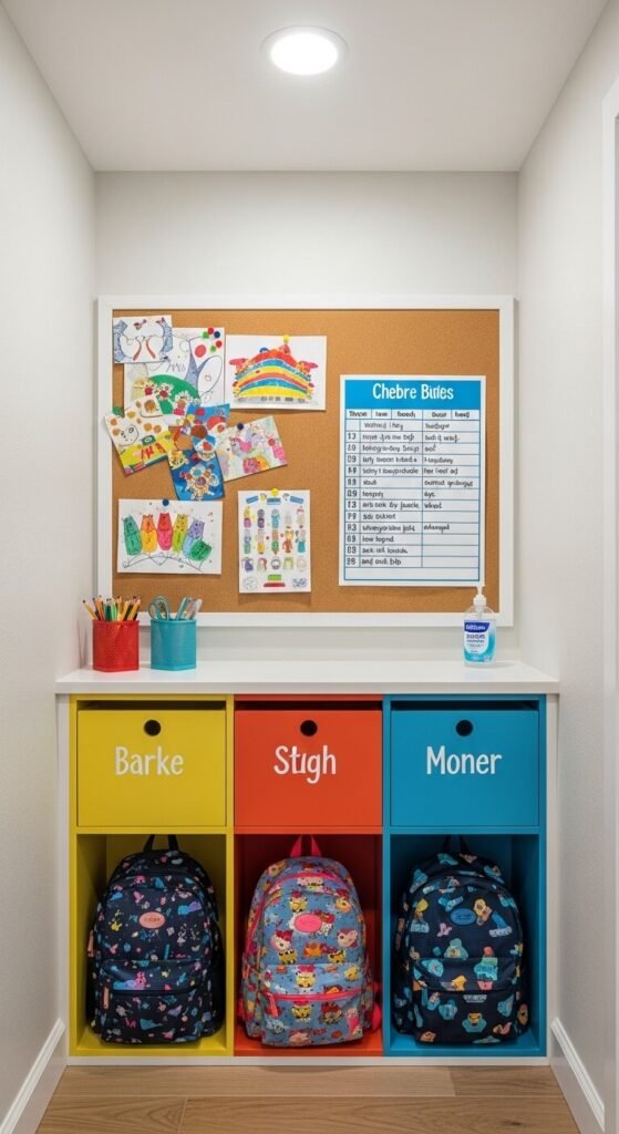 Kids bring home a constant stream of papers, projects, and permission slips. A dedicated homework corner inside the command center keeps it all in one place. Add a small corkboard for artwork and school notices. Use labeled cubbies or bins — one per child — for backpacks and folders. A pencil cup and a stapler nearby means no more hunting for supplies. This corner teaches kids organization habits they’ll carry for life.
