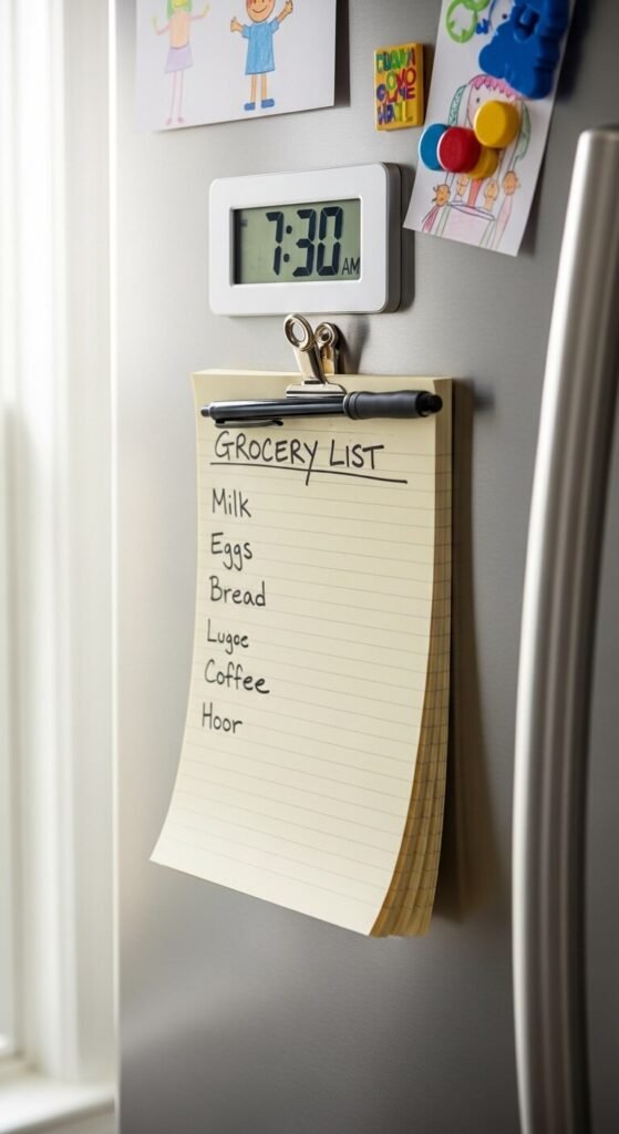 Running to the store and forgetting the one thing you needed — again. Fix it with a magnetic notepad or tear-off list pad mounted right in the command center. When you finish the last of something, jot it down immediately. Some families keep one list for groceries and a second for errands. A pad of 50 sheets costs about $3. Prefer digital? Mount a small whiteboard and snap a photo of the list before you leave.