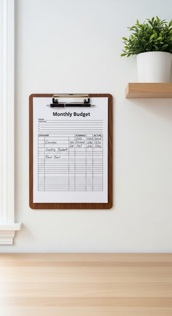 Bills sneak up when you’re not watching. A budget tracker clipboard in the command center keeps finances visible. Print a simple monthly budget sheet — dozens of free templates exist online — and update it weekly. Clip current bills to it so nothing gets forgotten. A decorative clipboard costs $5–$10. This one habit alone can stop late fees and overdrafts. Seeing the numbers regularly makes spending decisions feel more real.