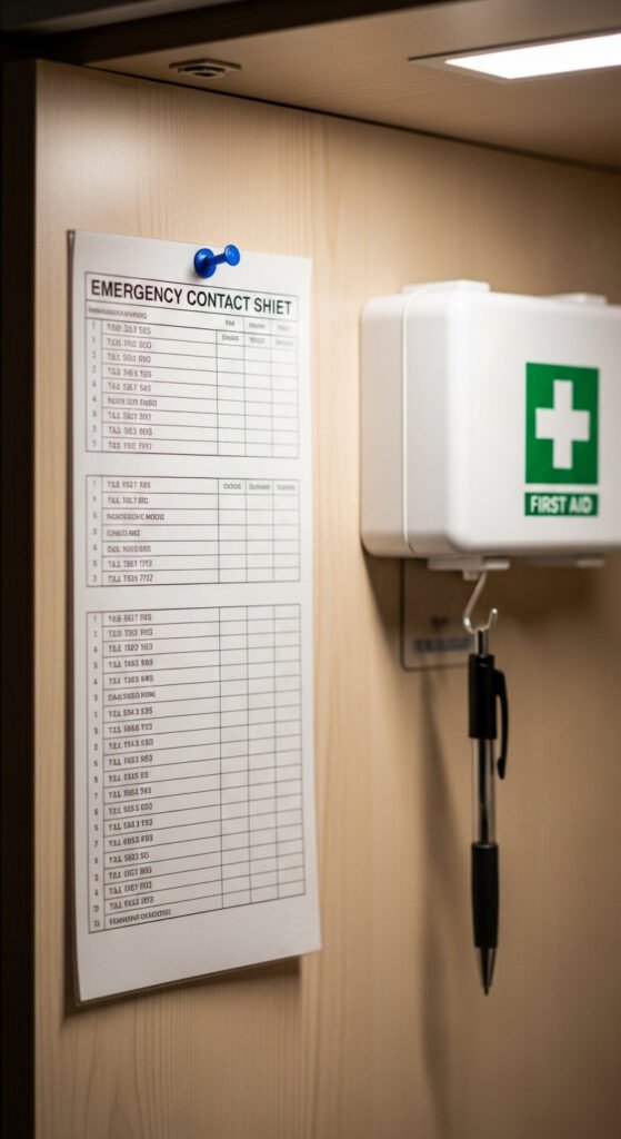 In an emergency, you don’t want to search your phone. A laminated emergency info sheet pinned in your command center keeps critical details ready. List doctor numbers, a neighbor’s contact, insurance info, and the address of your nearest urgent care. Update it once a year. Print it at home for free, laminate it for $1 at a copy shop, and pin it where anyone — including a babysitter — can find it fast.