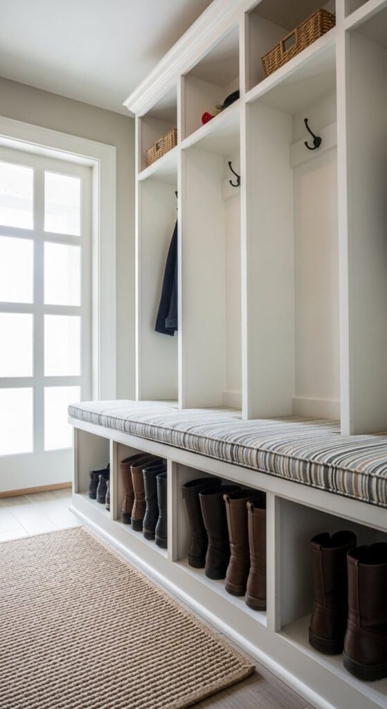 Shoes scattered across the entryway are a tripping hazard and an eyesore. A shoe drop zone built into your command center keeps things tidy. A simple open cubby bench ($40–$80) gives each family member their own spot. No room for furniture? Mount a low shelf along the wall and keep a woven basket below. Add a small boot tray to catch mud and rain. The rule: shoes off, shoes away.