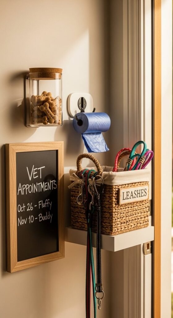 Pets have routines too. A pet care corner in your command center keeps it all in one spot. Hang leashes on a hook. Store bags, collars, and grooming supplies in a labeled basket. Add a small board to track vet appointments and flea treatment dates. If your pet takes medication, include a simple tracker so nothing gets skipped. This is especially handy if multiple people in the household share pet duties.