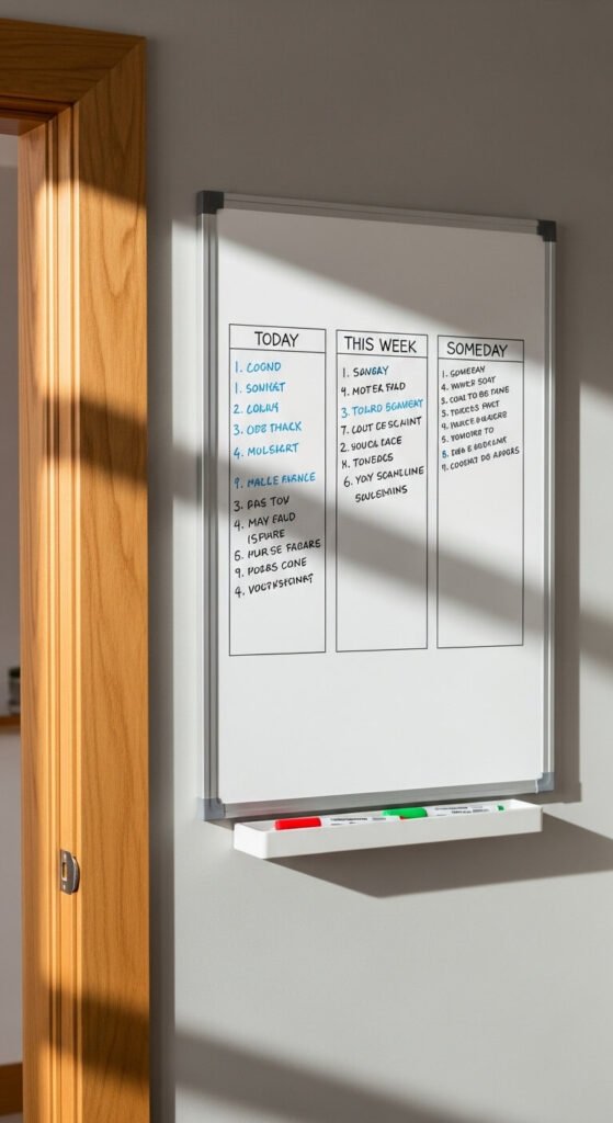 A to-do list you can’t ignore. A whiteboard mounted at eye level in your command center makes your tasks visible every time you walk by. Divide it into three columns: Today, This Week, and Someday. Check things off in real time. A small framed whiteboard costs $15–$25. Prefer a no-buy option? Paint a section of wall with dry-erase paint (about $20 a can) for a seamless built-in look.