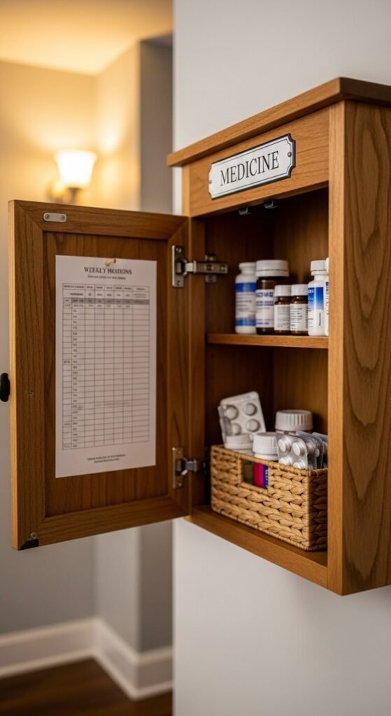Keeping track of who takes what — and when — is harder than it sounds. A medicine tracker in your command center prevents missed doses and double-dosing. Use a printed weekly grid, one row per person. A small wall-mounted cabinet hides supplies while keeping them accessible. Label shelves clearly. If children are in the home, mount it higher and add a simple latch. Review the tracker every morning alongside the family calendar.
