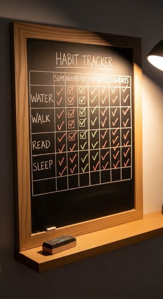 Small habits compound fast. A visual habit tracker in your command center makes daily wins visible. Draw a simple grid — habits on one axis, days of the week on the other. Check off each habit daily. Use a chalkboard, a dry-erase board, or even a printed sheet in a frame. Seeing a streak of checkmarks is motivating. Missing one day is okay — the goal is consistency over perfection, and the board keeps it honest.