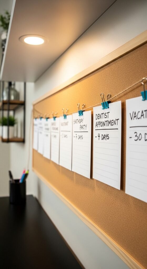 Big events sneak up. A countdown strip in your command center gives upcoming appointments, vacations, and deadlines a visual presence. Pin index cards to a thin corkboard strip — one card per event, with the date and days remaining. Update the count every Monday. It takes 30 seconds and prevents the “I completely forgot about that” panic. Great for kids who are excited about trips, birthdays, or school events too.