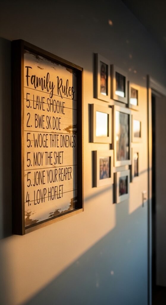 Some command centers go beyond logistics. A family values or house rules board makes your household culture visible. Keep it short — five rules max. Things like “We speak kindly” or “We clean up after ourselves.” Paint them on a wood plank or print and frame them. This isn’t about being rigid — it’s about having a shared foundation. Kids internalize what they see repeated. Put it where everyone passes daily.