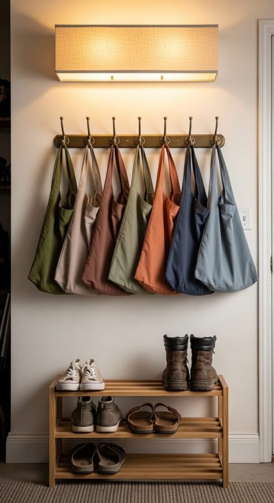 Reusable bags are useless if you forget them. A bag hook station near your exit door makes grabbing them automatic. Mount three to five hooks at a convenient height. Fold bags flat before hanging so they stay neat. Some people clip a small list of frequently bought items to one bag so they’re ready to shop immediately. This single habit reduces plastic waste and saves you the $0.10 per bag fee every grocery run.