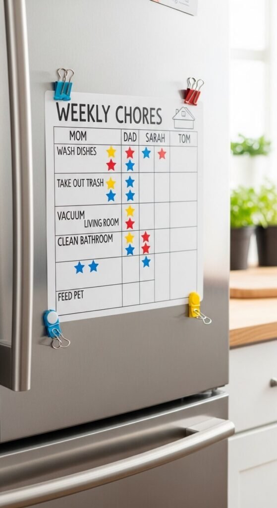 Chores get done when they’re assigned and visible. A chore chart mounted in the command center removes the guessing and the arguing. Print a grid with names across the top and chores down the side. Laminate it and use stickers or dry-erase marks to track completion. Rotate chores weekly so no one gets stuck with the same job. Kids as young as four can have a simple task on the chart — it builds responsibility early.