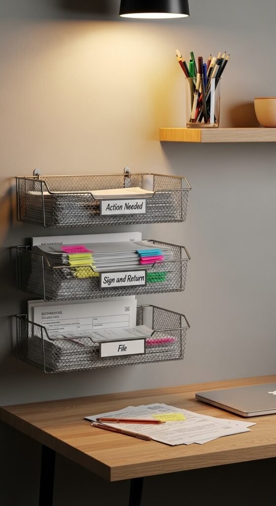 School papers multiply fast. A three-tier tray labeled “Action Needed,” “Sign and Return,” and “File” processes the daily flood without piling up. Mount it on the wall at adult eye level — out of reach from little hands. Go through it every evening, even briefly. It takes five minutes to sign forms and move things to the right spot. A wire wall-mount tray costs about $12 and saves hours of hunting each month.