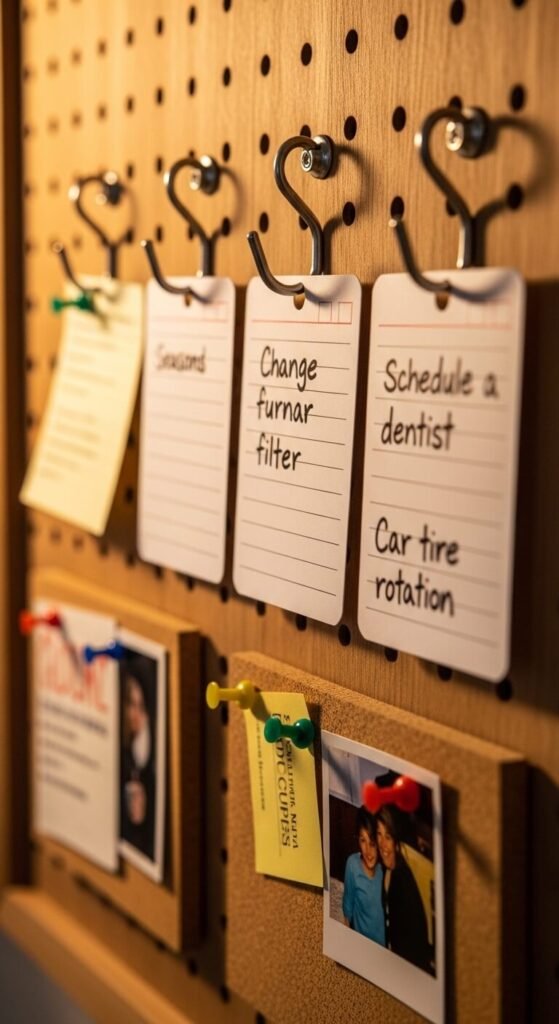 Some tasks only come up every few months — and that’s exactly when they get forgotten. A seasonal reminder section on your command center holds recurring tasks. Write them on index cards: change furnace filter, schedule dentist, check fire alarms, rotate tires. Hang them with clips or push pins. Flip to the next one when a task is done. These small maintenance jobs protect your home and health — keeping them visible means they actually happen.