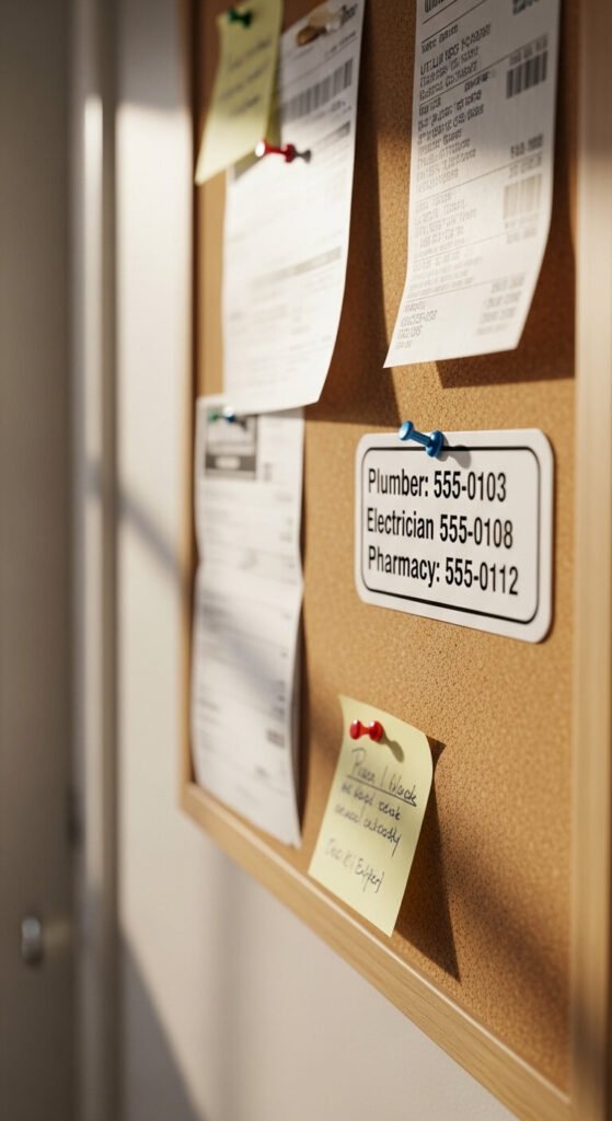 When the pipe bursts, you don’t have time to Google. A local resource card pinned in your command center lists numbers for your plumber, electrician, pediatrician, pharmacy, and trusted neighbors. Print it in a large, readable font. Laminate it for durability. Update it once a year. This card is especially useful for babysitters, house sitters, or anyone helping out when you’re away. Two minutes to make. Potentially hours saved in a stressful moment.