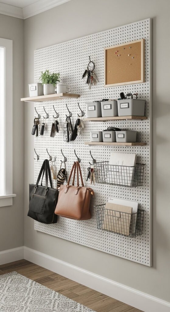 The most flexible command center of all. A pegboard wall system lets you rearrange hooks, shelves, and bins as your household’s needs change. A 2×4 ft pegboard runs about $20 at hardware stores. Paint it any color. Add metal hooks ($5 for a pack), small wooden shelves, wire baskets, and a corkboard square. Rearrange whenever life shifts — a new baby, a move, a new school year. Nothing is permanent, everything is useful, and the whole thing costs under $60.