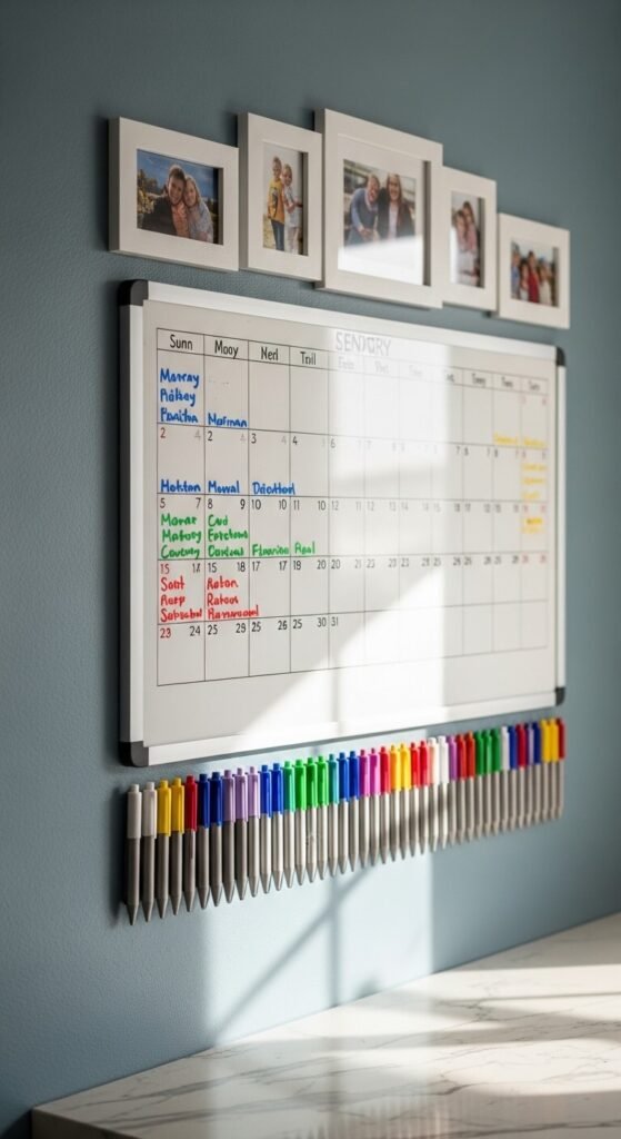 A shared calendar is the backbone of any command center. Color-code each family member so schedules are readable at a glance. A large dry-erase calendar costs about $20 at most office supply stores. Mount it at eye level near the door everyone uses most. Prefer free? Print a monthly template and slip it into a dollar-store frame — write on it with dry-erase markers. Update it every Sunday so the week ahead is always clear.