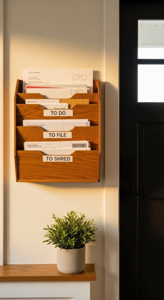 Paper clutter is the enemy. A simple mail sorter with labeled slots — “To Do,” “To File,” “To Shred” — stops piles before they start. Wall-mounted versions start at around $15. A DIY option: repurpose a magazine rack or stack wooden crates from a craft store. Place it right where you drop your bag so sorting becomes automatic. Deal with each slot once a week and paper chaos becomes a thing of the past.