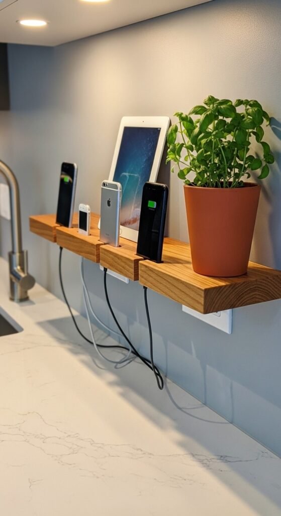 Phones on the counter, tablets on the couch — chargers everywhere. A dedicated charging shelf near an outlet solves this fast. Buy a $25 bamboo charging station organizer, or drill small holes in a floating shelf to thread cables through neatly. Label each slot with a small tag so everyone knows where their device lives. Bonus: charging overnight in a central spot keeps devices out of bedrooms, which is better for sleep.