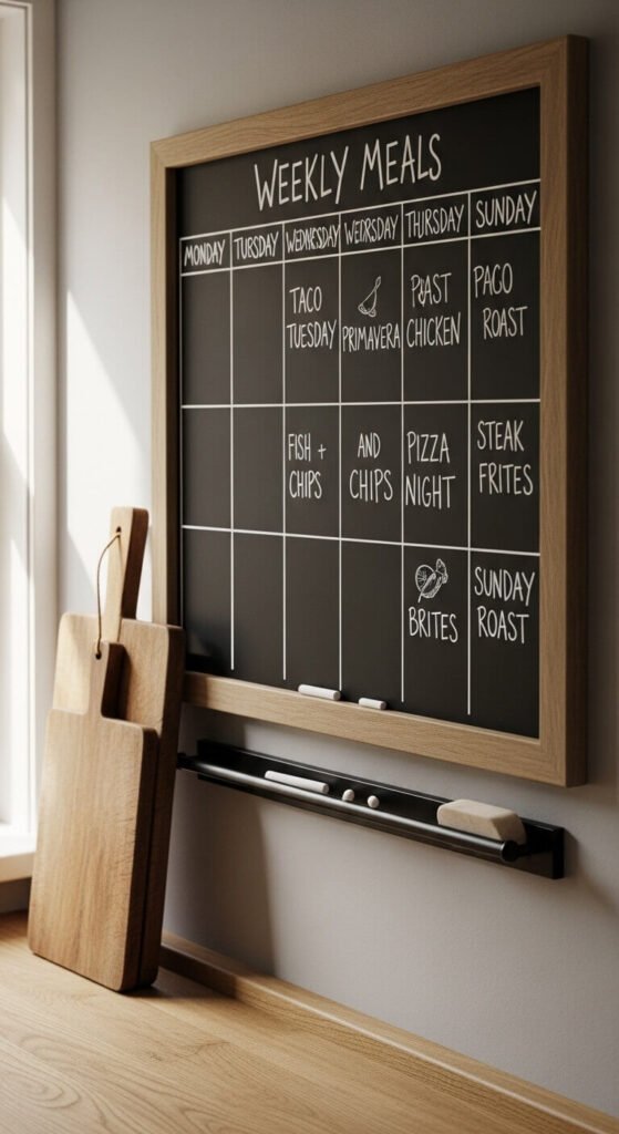Staring into the fridge at 5 PM is a daily struggle. A meal planning board ends the guesswork. Use a chalkboard, a dry-erase board, or even a framed piece of dark card stock. Divide it into seven columns — one per day. Fill it in on Sunday. List dinner only, or go all in with breakfast and lunch too. Knowing the plan also makes grocery shopping faster and cheaper. Less food waste, fewer last-minute takeout orders.