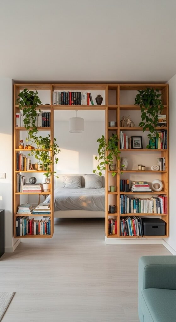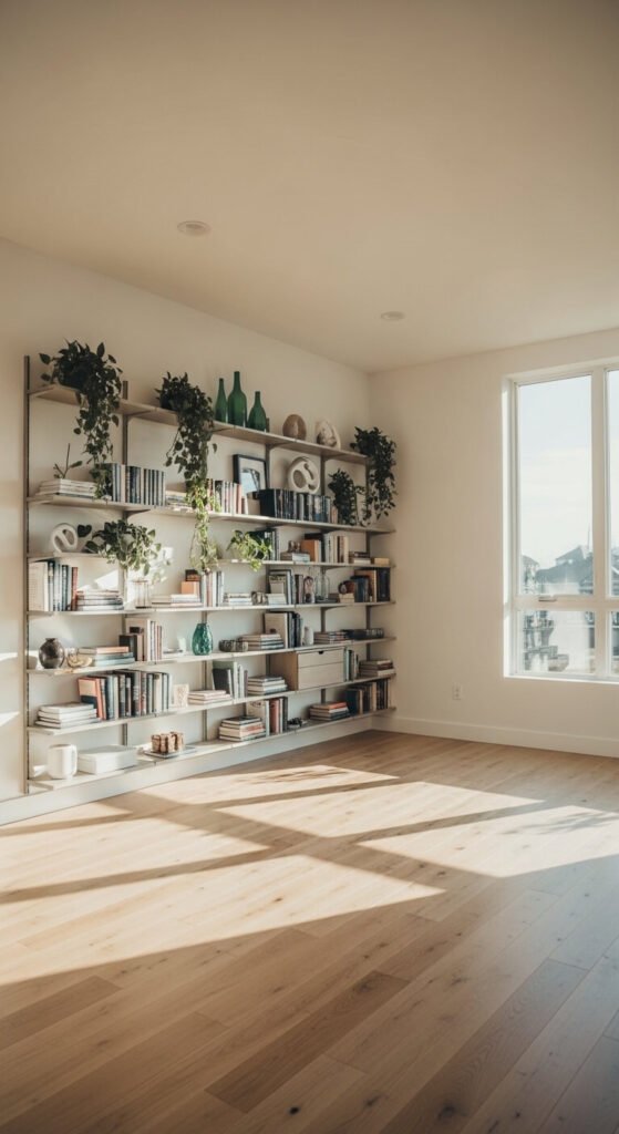 In open-plan spaces, a large floor-to-ceiling wall-mounted bookcase defines zones without blocking light. Mount vertical standards to the wall studs and add adjustable shelves at whatever heights you want. The whole unit is wall-supported — zero floor footprint, zero tipping risk. Brackets and standards cost $30–$60 depending on the wall size. Add wooden shelves from a hardware store cut to size. You get massive storage and a room divider in one structure.