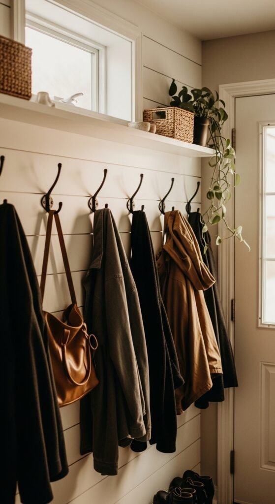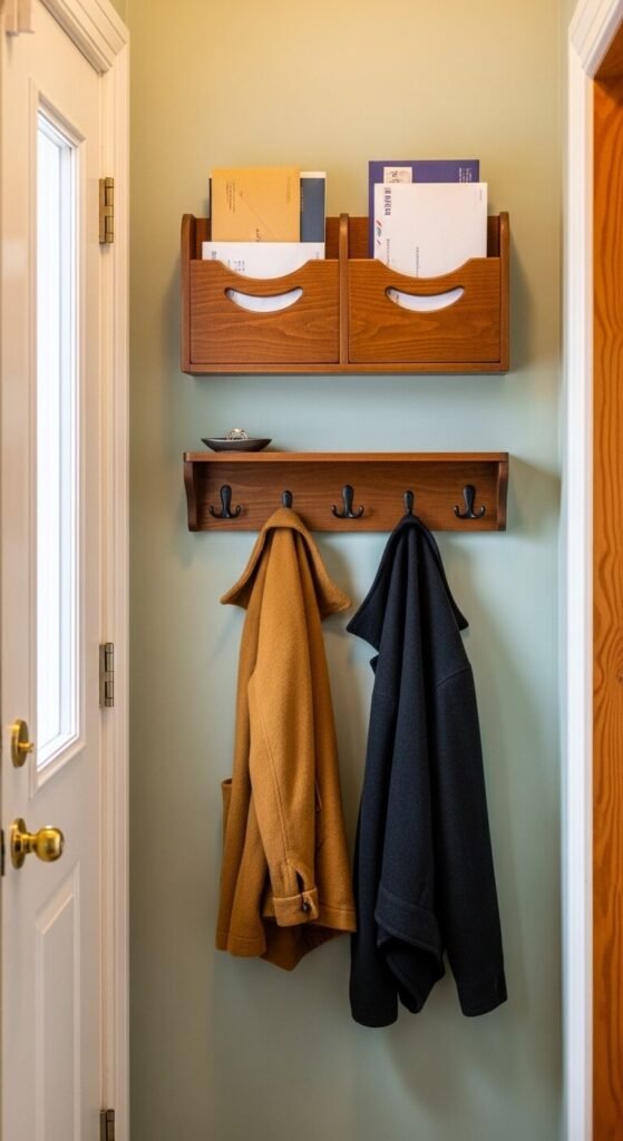 How many times have you lost your keys this month? A wall-mounted key and mail station near your front door solves that permanently. You can buy a combo unit for $25–$50, or DIY one using a piece of reclaimed wood, a few cup hooks, and small wooden boxes. Mount it right at the door at eye level. Keys hang. Mail slots in. Nothing hits the floor or the counter. It’s a small thing that makes mornings run dramatically smoother.
