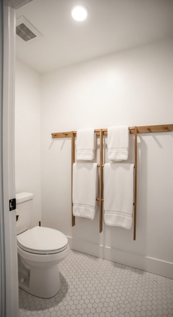 A mounted towel ladder works in even the narrowest bathroom. Rather than leaning against the wall (where it always tips), mount it directly using two wall brackets. It holds multiple towels without a rod taking up precious space. Wooden ladder racks run $30–$80. Or buy a basic wood ladder from a craft store for $20 and mount it yourself. Use it over the toilet or on any blank bathroom wall. It adds warmth and keeps your floor towel-free.