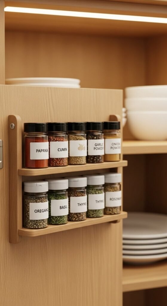 The back of a cabinet door is prime hidden storage real estate. A simple spice rack screwed to the inside of a door keeps spices off your counter and shelf entirely. These racks run $10–$20 and install with four screws. No floor space. No counter space. No shelf space. The spices live inside the cabinet door and swing out of sight when you close it. Works for cleaning supplies under the sink, too — same concept.