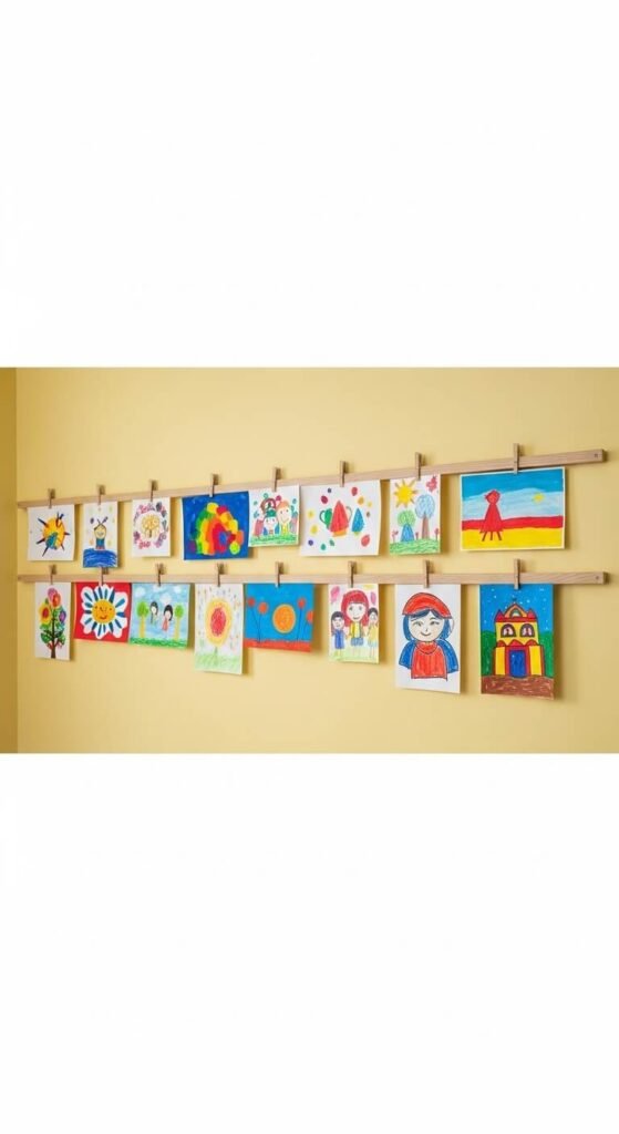 Kids produce more art than any home can handle. A wall-mounted art display rail lets you rotate and celebrate their work without stacking it on counters or cramming it in drawers. Install a simple wooden dowel or picture ledge at child height and use small binder clips or clothespins to hang artwork. The whole thing costs under $15. Swap pieces in and out any time. It turns their art into décor and keeps surfaces clear of the paper pile-up.