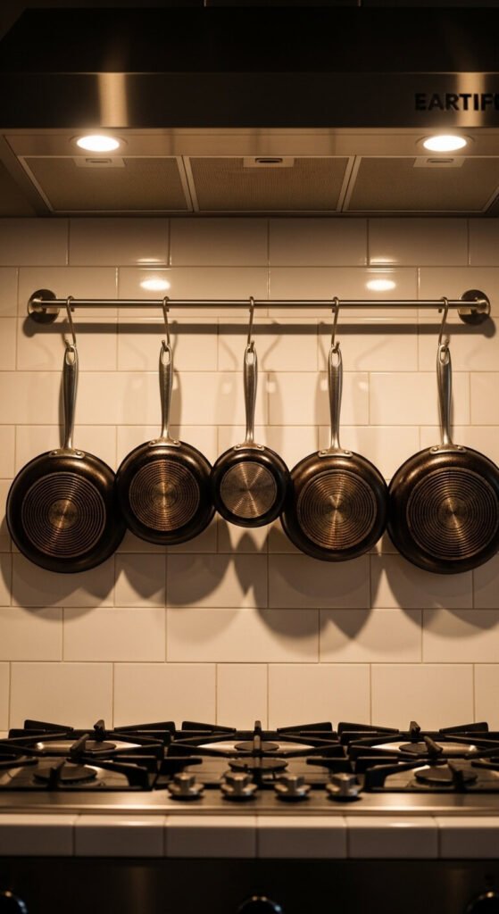 Hanging your pots and pans on a wall rail is the single fastest way to free up a full cabinet. A 36-inch wall rail with S-hooks costs $25–$50 and holds your six most-used pieces right where you cook. No more stacking and crashing lids, no more digging for the right pot. Mount it on the wall above your stove or on any open kitchen wall with clear studs. It also looks professional and purposeful in any kitchen style.
