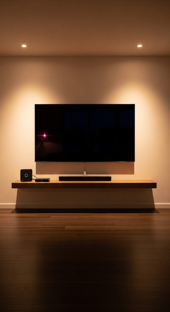 A TV stand with legs is one of the biggest floor-space offenders in the living room. Mount your TV on the wall and replace the stand with a single floating media shelf below. The shelf holds your streaming box, remotes, and maybe a soundbar. The floor underneath is completely open. TV wall mounts start at $25. The floating shelf adds another $20–$40. You get a cleaner look and the sensation of more square footage — because you actually have it.