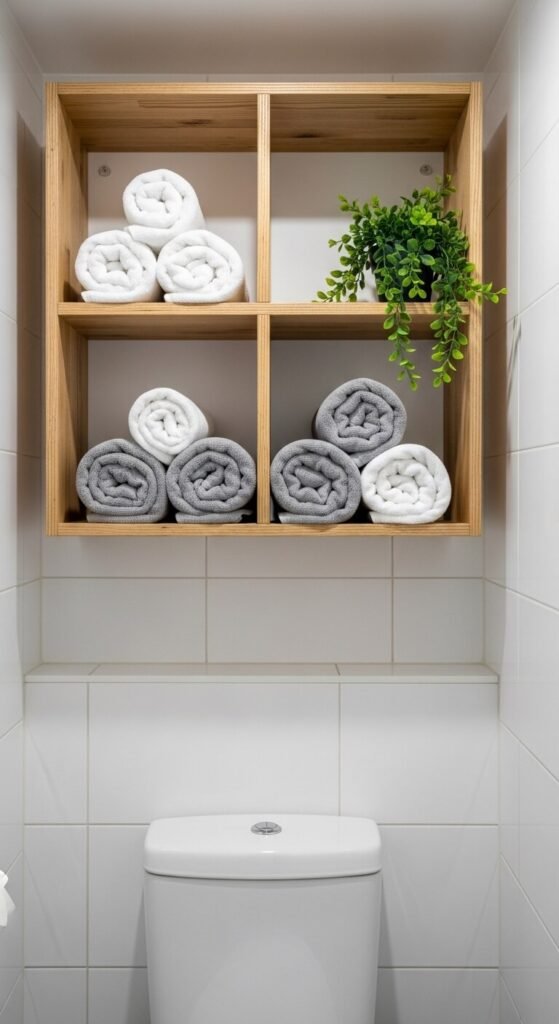Most small bathrooms have exactly zero linen storage. A wall-mounted cubby unit above the toilet changes that completely. A 2×2 open cubby shelf fits in the space most people just ignore above their toilet tank. Rolled towels, extra toiletries, and spare toilet paper fill it perfectly. These units run $40–$80 at most home stores, or you can build one with basic plywood for under $30. The floor stays clear and your bathroom actually looks organized.