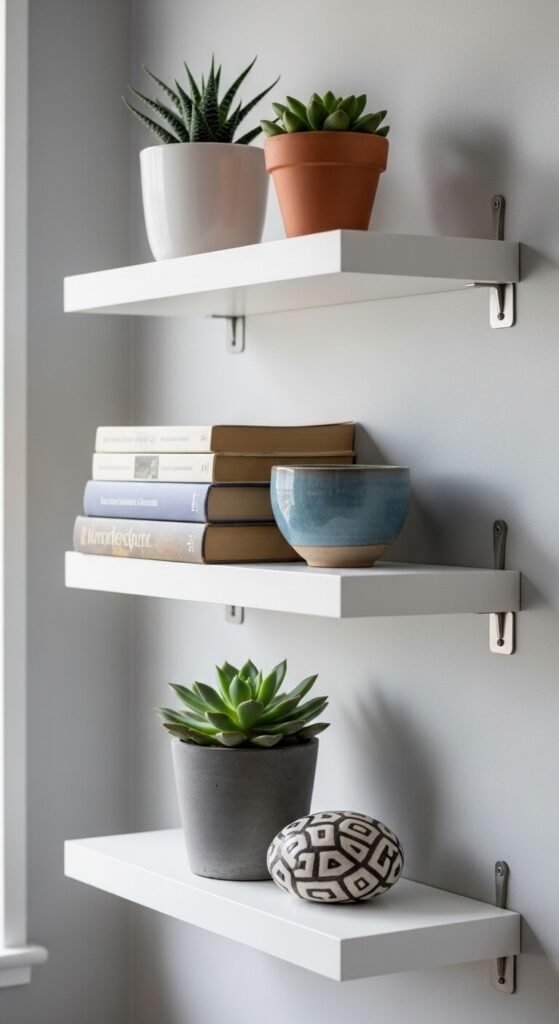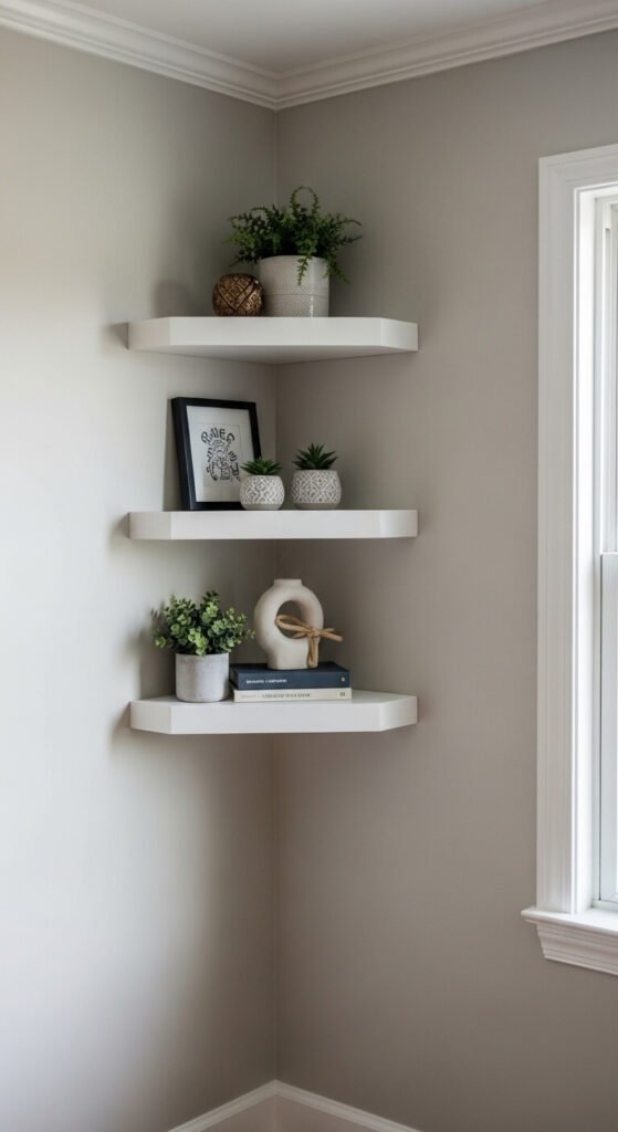 Corners are wasted space in almost every room. Floating corner shelves slip right into that dead zone and suddenly you have storage where there was nothing. They come in L-shaped designs that mount on both walls for extra stability. A set of two runs about $20–$35. Paint them to match your wall color and they disappear into the room — all you see is the stuff you’re displaying. Great for plants, books, or anything that otherwise piles up on flat surfaces.