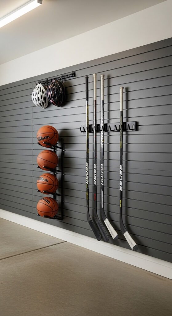 Sports gear takes over garages fast. A wall-mounted sports organizer — using slatwall panels or individual ball racks and hook systems — gets everything off the floor and onto the wall in a way that’s actually accessible. Slatwall panels run $30–$60 for a 4×8 section. Add specific hooks and racks for balls, bats, sticks, and helmets. The floor becomes parking space again. Everything has a home and the kids can actually put things back where they belong.