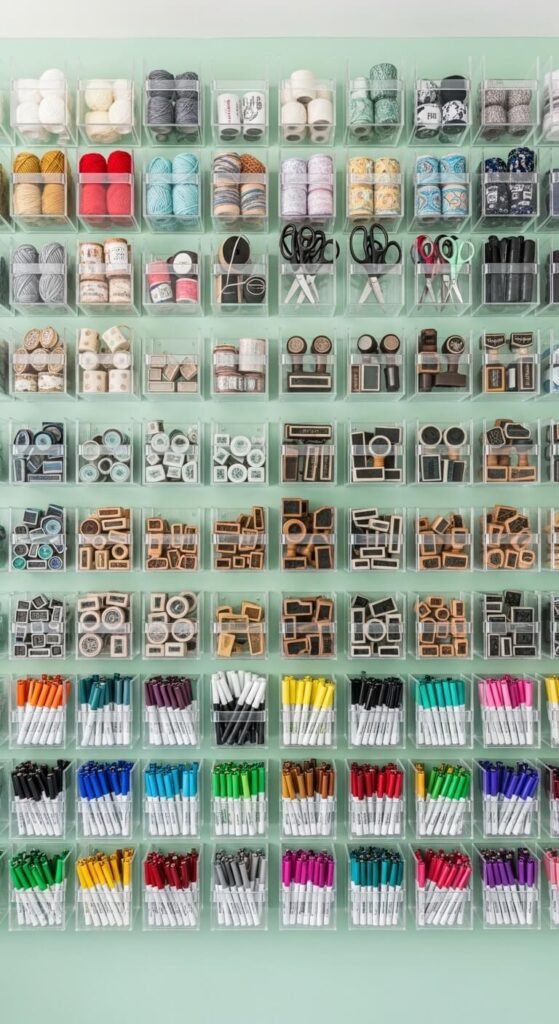 Craft supplies multiply silently and take over every surface. A wall-mounted bin system puts everything in clear containers, right at eye level, visible at a glance. Grid wall panels with attached wire bins cost around $30–$50 for a full wall setup. Individual acrylic wall-mount bins run $2–$5 each. Mount them in rows and sort by color, type, or project. Your table clears completely. You actually know what supplies you have, so you stop buying duplicates.