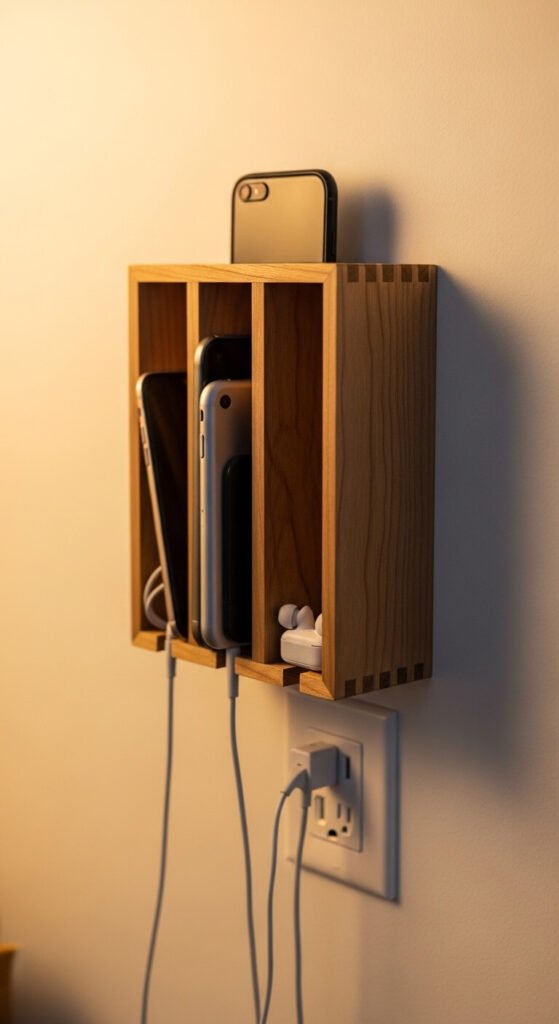 Charging cables draped across counters and desks are a visual nuisance. A wall-mounted charging station mounts right beside an outlet and keeps every device off the counter and in one spot. You can buy pre-made units for $25–$50, or DIY with a small wooden box and a power strip inside it. Cables feed through holes in the bottom. Devices slot in from the top. The counter clears up and the charging chaos disappears behind a clean-looking box.