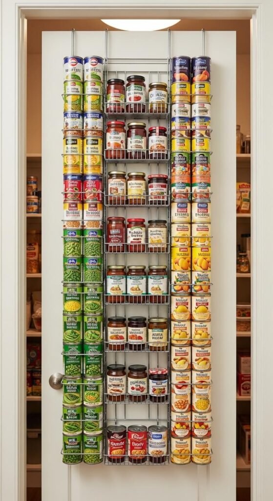 The back of your pantry door is a full shelving unit waiting to happen. Over-door mounted can organizers attach in minutes with no drilling and hold 30–50 cans depending on the unit. Models run $20–$50. You reclaim that space on your actual pantry shelves for bigger items. Cans are now visible at a glance — no more buying a third can of diced tomatoes because you couldn’t see the two already hiding in back. One of the highest return-on-investment kitchen upgrades possible.