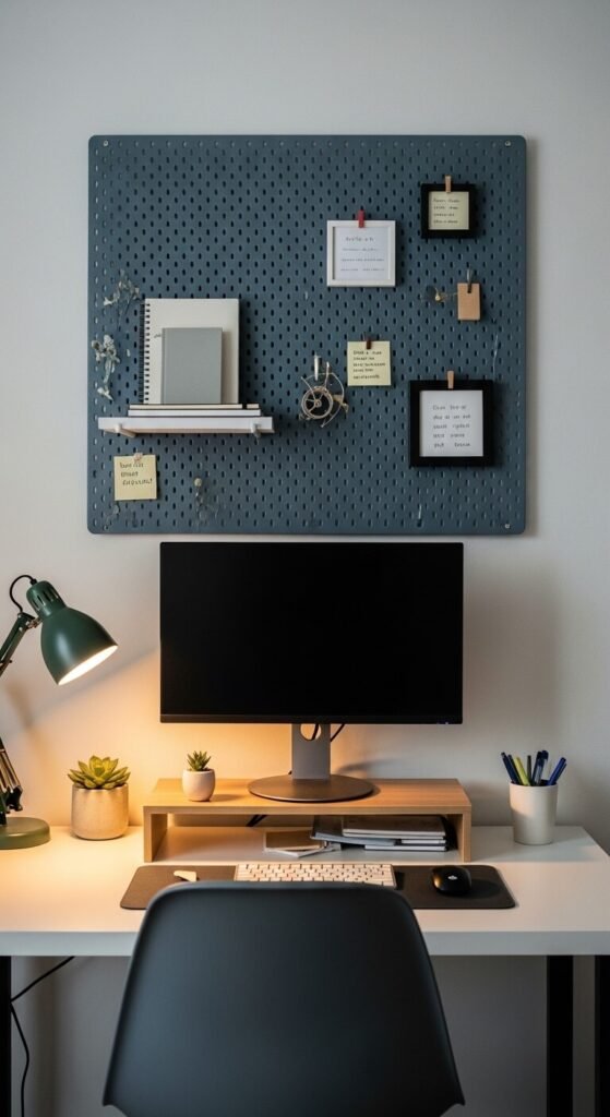Desk clutter happens to everyone. A pegboard above your desk gives every item its own home on the wall instead of piling up on your workspace. Mount a 2×4-foot pegboard directly above the desk surface. Add hooks for headphones, baskets for notebooks, and small shelves for a plant or snacks. Painted to match your wall, it becomes a feature, not a patch. The desk stays clear for actual work. Total cost: under $50 for the board, hooks, and paint.