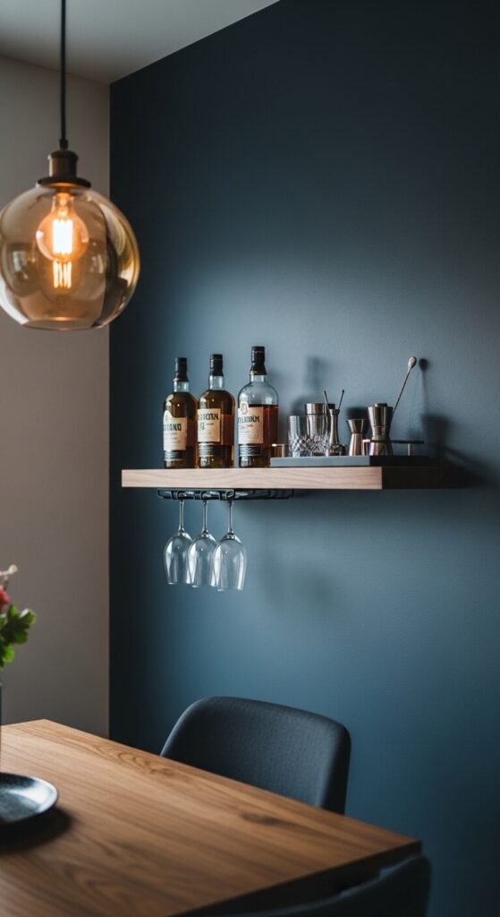 Floor bar carts are charming but take up serious footprint. A mounted bar shelf with a stemware rack underneath achieves the same effect with zero floor use. Mount a deep 12-inch floating shelf at bar height and attach an under-shelf wine glass rack beneath it. The shelf holds bottles and a tray. Glasses hang inverted from the rack. The whole setup costs $40–$80. The floor space where the cart used to sit is now open, and the look is just as intentional.