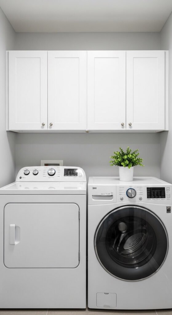 Laundry rooms accumulate detergent, dryer sheets, and cleaning products with no system. Wall-mounted cabinets above your washer and dryer fix this completely. They keep products hidden behind doors, off the appliance tops, and accessible without bending down. Stock cabinet boxes from a home improvement store run $60–$100 per cabinet. Add basic handles and hinges and mount to wall studs. The laundry room suddenly looks intentional — and you stop knocking bottles off the washer every time you open the lid.