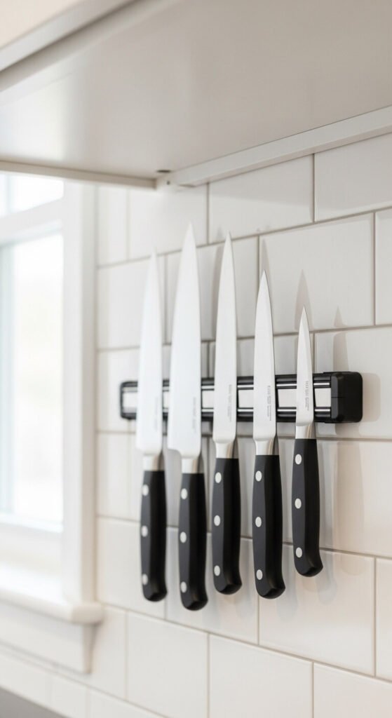 A knife block on the counter takes up more space than you realize. A magnetic knife strip mounted to the wall holds all your knives at arm’s reach with no counter footprint at all. Stainless steel strips run $15–$35. Wooden versions run $20–$50. Two screws into a stud and it’s done. Knives are visible, accessible, and stored safely — better than digging through a drawer. Your counter space opens up and the kitchen looks more like a real cook’s space.