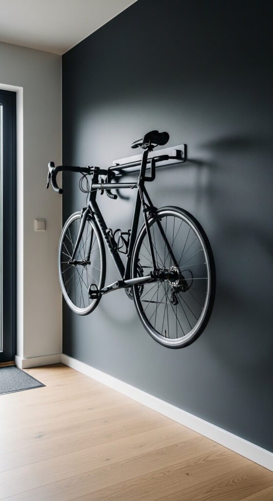 Bikes are floor-space killers. A single wall-mounted bike hook (around $15–$30) moves your bike off the ground and turns it into wall art. Install one hook for a horizontal hang or two for a vertical display. Most hooks screw directly into studs — no special tools required. This works in garages, hallways, mudrooms, and even bedrooms. Your floor opens up completely. Pair it with a small mounted shelf below for helmets and gear.