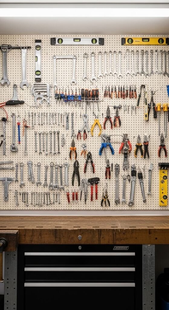 A pegboard wall is the most affordable garage upgrade you’ll make. A 4×8 sheet costs around $30 at a home improvement store. Add metal hooks and bins for another $20. Everything from wrenches to extension cords hangs in plain sight so you can actually find what you’re looking for. No more digging through drawers. You can rearrange hooks any time your storage plan changes. It takes one afternoon to install and completely transforms a cluttered garage.