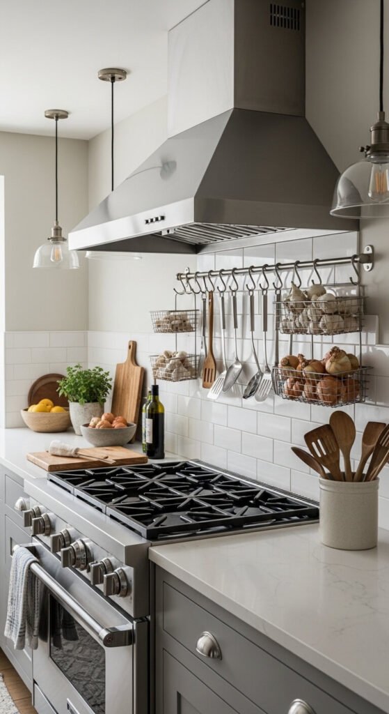 A mounted kitchen rail clears off your counters in one shot. These systems — sometimes called “pot rails” — mount directly to your wall or backsplash and hold hooks, baskets, and even small shelves. IKEA’s GRUNDTAL rail system is a popular budget option under $25. Hang your most-used utensils, spices, and small pots within arm’s reach. Your counter becomes a workspace again instead of a dumping ground. Great for small kitchens where every inch of counter matters.