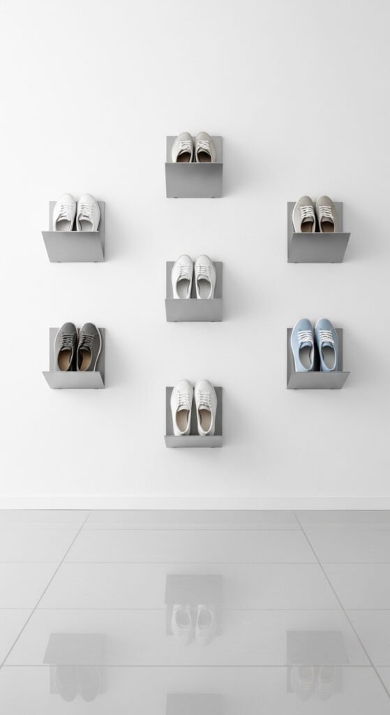 Shoes by the door create instant chaos. A wall-mounted shoe rack changes that without eating any floor space. Individual angled shelf brackets hold one pair each and mount with two screws per bracket. You can add as many as your wall allows. The whole setup costs around $30–$60 depending on how many pairs you need. For a rental-friendly option, over-the-door organizers mounted high on the back of closet doors work just as well.
