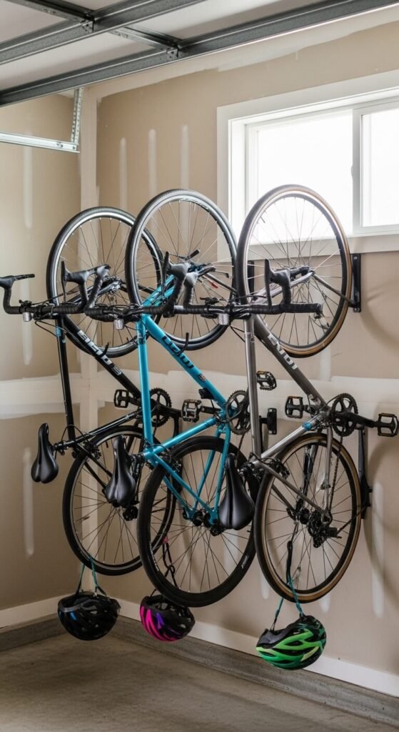 Bikes eat floor space fast. A simple vertical wall hook costs $15–25 per bike and takes 10 minutes to install. Screw directly into a stud for secure hold. Hang bikes by the front wheel — most hooks are rubber-coated to protect rims. For families with multiple bikes, a row of hooks keeps everything tidy and accessible. Add a small shelf below each hook for helmets and gloves. This completely eliminates the floor clutter that bikes create.