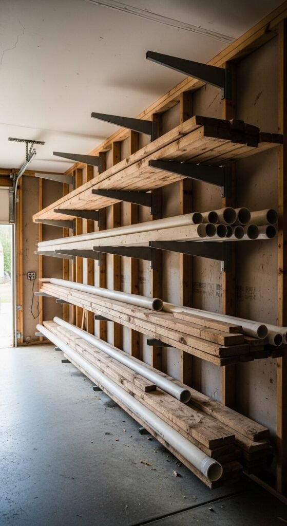 Long boards, pipes, and trim pieces are impossible to store neatly without a plan. A DIY lumber rack takes about an hour and costs under $20 in materials. Cut 2×4 arms and bolt them horizontally into studs at varying heights. Space them 16 inches apart vertically. Slide boards in horizontally. Keep heavy material on lower arms. This keeps long items off the floor and prevents warping. It’s a weekend project that pays off every time you need to grab a single board quickly.