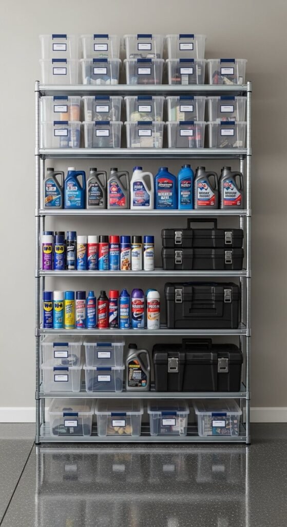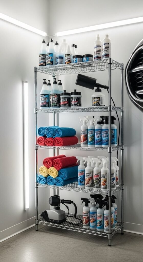 Keeping car care products scattered across shelves means you never have what you need when you wash the car. Group everything in one dedicated zone. Assign one shelving unit or cabinet section to car care only: washes, waxes, microfiber towels, tire cleaners, and applicators. Roll towels to save shelf space. A small labeled bin for each product category prevents the jumble. Mount a hook nearby for the foam cannon or wash mitt. This zone makes detailing faster and more consistent.